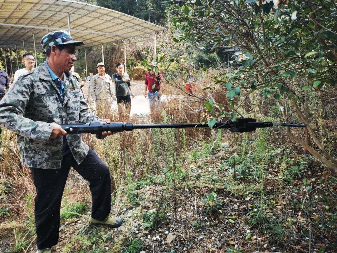 活动期间,曹成茂教授为当地茶农展示了机械化采摘油茶果“神器”。这是一款由安徽企业和安徽农业大学联合研发生产的手持便携式油茶专用采打机,可在陡坡大于30度的油茶林地使用,整机最大重量为5公斤,配套两块锂电池可连续工作六小时,具有重量轻、携带方便等特点,一套机器一天能完成五至十个工人的工作量,机械化采摘方式的普及,将大力提升采摘效率。