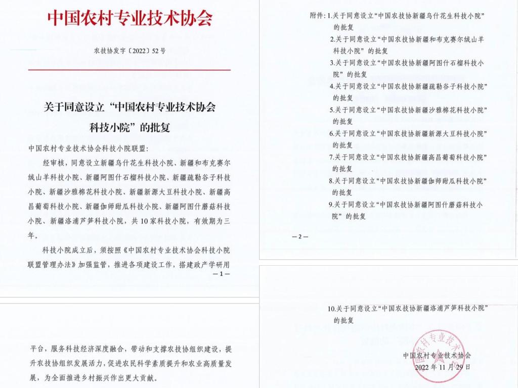 2022年下半年,新疆科协依托新疆农业大学、塔里木大学、新疆大学、新疆农业科学院、新疆畜牧科学院等高校和科研院所,联合各地、县科协,围绕新疆主导产业和特色产业,创建了第三批共10家中国农技协“科技小院”,分别是新疆乌什花生科技小院、新疆和布克赛尔绒山羊科技小院、新疆阿图什石榴科技小院、新疆疏勒谷子科技小院、新疆沙雅棉花科技小院、新疆新源大豆科技小院、新疆高昌葡萄科技小院、新疆伽师甜瓜科技小院、新疆阿图什蘑菇科技小院、新疆洛浦芦笋科技小院。截至目前,新疆共获批中国农技协“科技小院”30家,覆盖全疆13个地州市和兵团1个市,创建数量排全国前列。