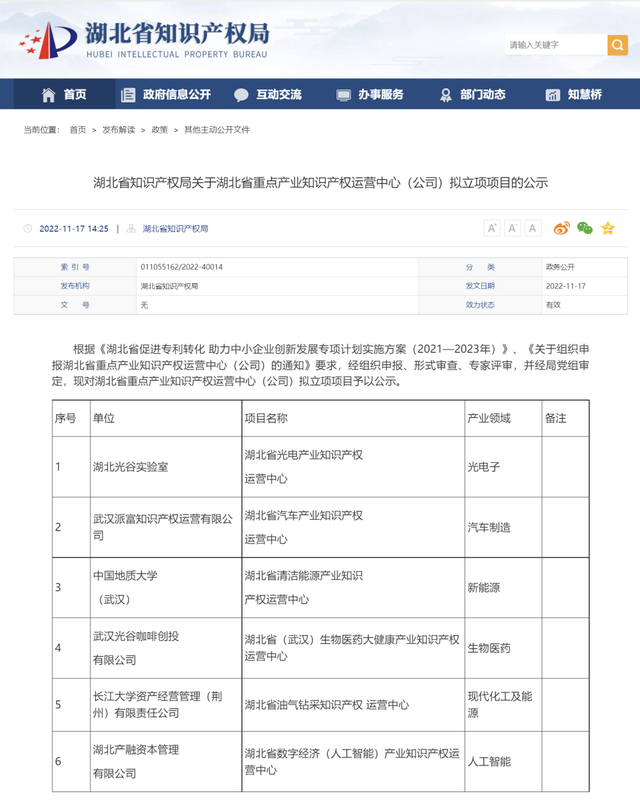 日前,湖北省知识产权局官网公示拟立项6个单位的知识产权运营中心项目。其中,湖北光谷实验室、武汉派富知识产权运营有限公司、中国地质大学(武汉)、武汉光谷咖啡创投有限公司等4家位于光谷。