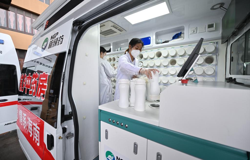 工作人员在“流动应急智能中药房”里将盛有单味中药浓缩颗粒的药瓶放入发药机。新华社记者 郭程 摄