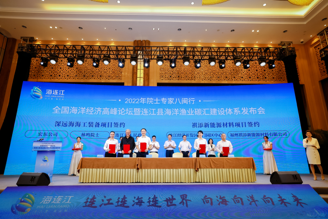 林鸣院士与连江县政府、宏东公司签约,助力“百台万吨”深远海养殖装备建设,为连江海洋经济发展提供重要人才支撑,打造连江在海洋渔业碳汇领域的人才智库;福州祺添新能源材料有限公司签约落地福州丝路海港城可门港区,全力补强产业链条,助力双碳目标的达成。会上还发布全国首个涵盖机制、标准、平台、项目的海洋渔业碳汇“1+3+1+N”建设体系。