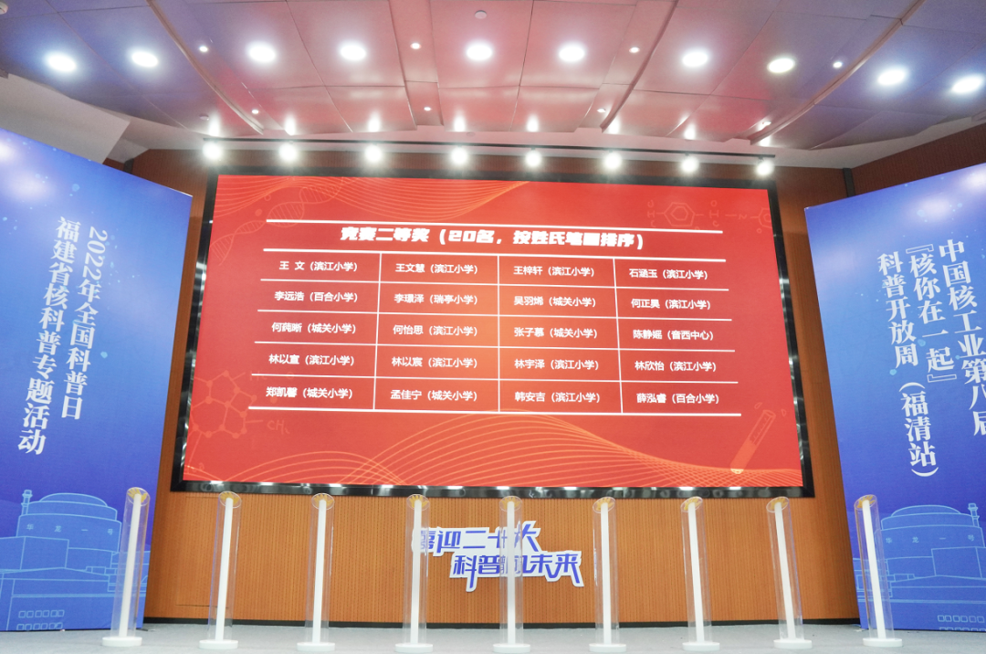 福清市实验小学、城关小学、玉融中学、龙田中心小学、崇文小学、海口中心小学、元樵中学、音西中心小学、教师进修学校附属小学、滨江小学等10家单位荣获优秀组织奖;刘晗等10名学生荣获竞赛一等奖,王文等20名学生荣获竞赛二等奖,王元也等30名学生荣获竞赛三等奖,石佳烨等50名学生荣获竞赛优胜奖;万里等100名同志荣获“核科普知识达人”荣誉称号。活动现场还进行了优秀组织奖代表颁奖仪式。