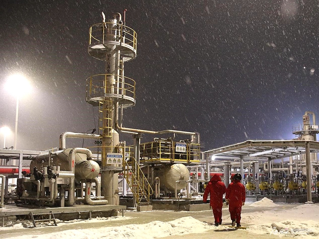 中国石油新疆油田公司呼图壁储气库的员工夜间在雪中巡检。(摄影:薛梅)