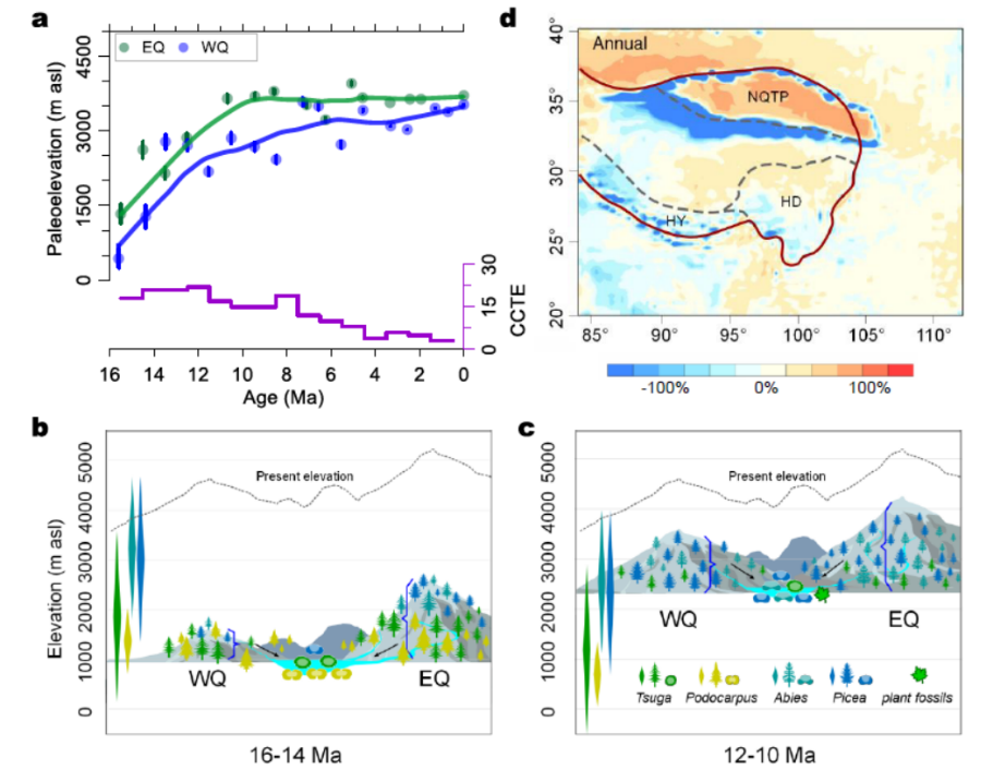 研究团队利用青藏高原东北部柴达木盆地四条年代准确的剖面和钻孔的孢粉数据,结合剖面上发现的植物化石,利用新建立的现代海拔计算方程,分别获得了柴达木盆地东段和西段两侧山体1600万年来连续的古高度变化记录,揭示柴达木盆地在约1500万年前东、西部的古海拔分别为约1332米和约433米,此后东段在约1100万年前迅速抬升至约3685米,西段在约700万年前迅速增加至约3589米,接近现代高度。