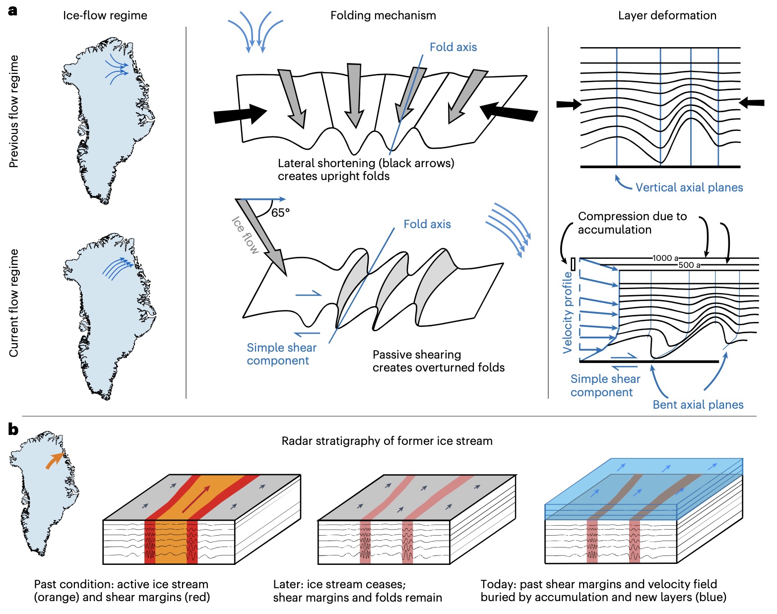 德国阿尔弗雷德·魏格纳研究所的科学家们此次利用雷达数据分析了深埋在东北格陵兰冰盖下的冰层,再用来重建该地区以往的冰流模式。他们发现有一系列突出的褶皱提示这些冰向着当前东北格陵兰冰流北部快速流动。从这些褶皱的方向和它们的变形方式可以判断,至少曾存在过两支现在已经不活跃的冰流。虽然很难确定这些特征的具体年代,但研究人员认为,这些冰流活跃的时期至少持续到了全新世早期(约1.15万年前),而且它们的源头来自比现代冰流更靠北的地区。