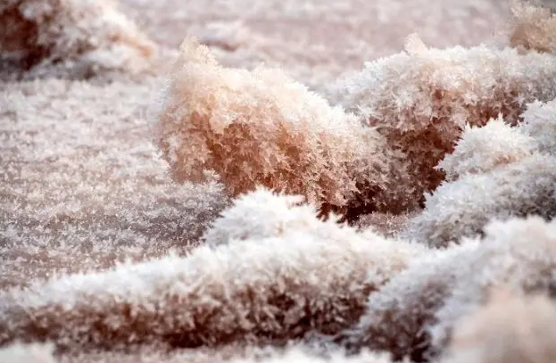 连日来,随着气温不断下降,有着“中国死海”之称的山西运城盐湖出现了冬日特有的“硝花”景观。这些“硝花”凌寒怒放,吸引了不少游客前来观赏。