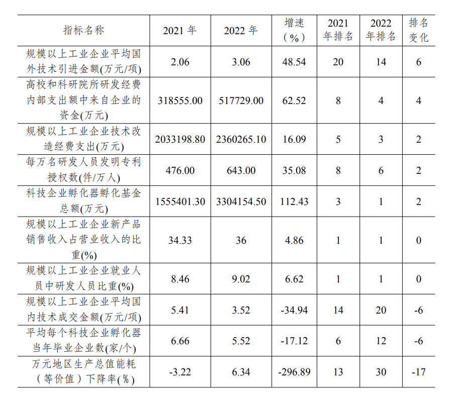 浙江省创新能力综合指标(局部)。浙江省科技厅供图