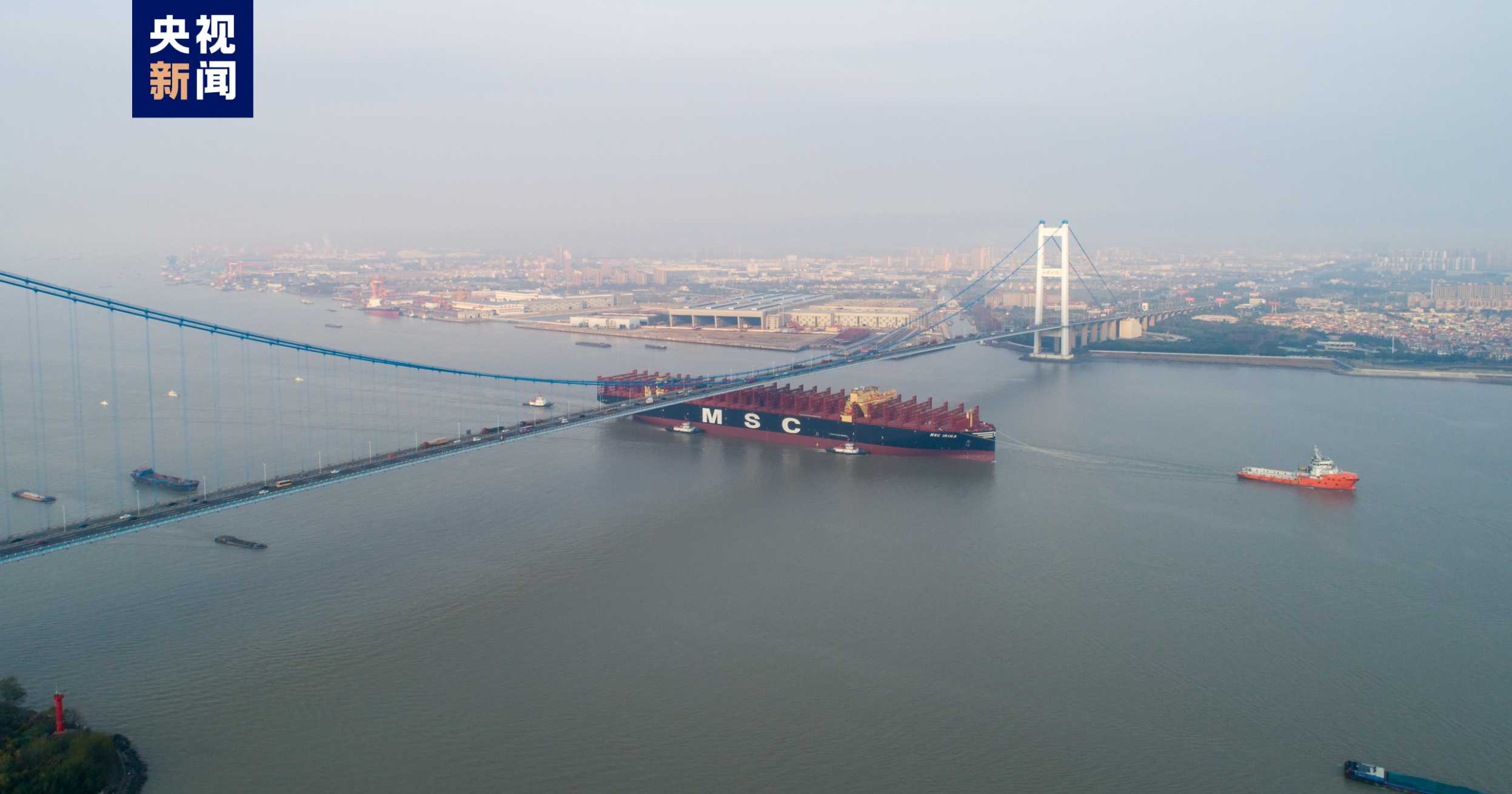 12日,全球最大新造集装箱船“鑫福102”轮在江苏泰兴扬子鑫福船厂离泊,在海事部门21艘海巡艇接替护航下,安全拖带至太仓扬子三井船厂。
