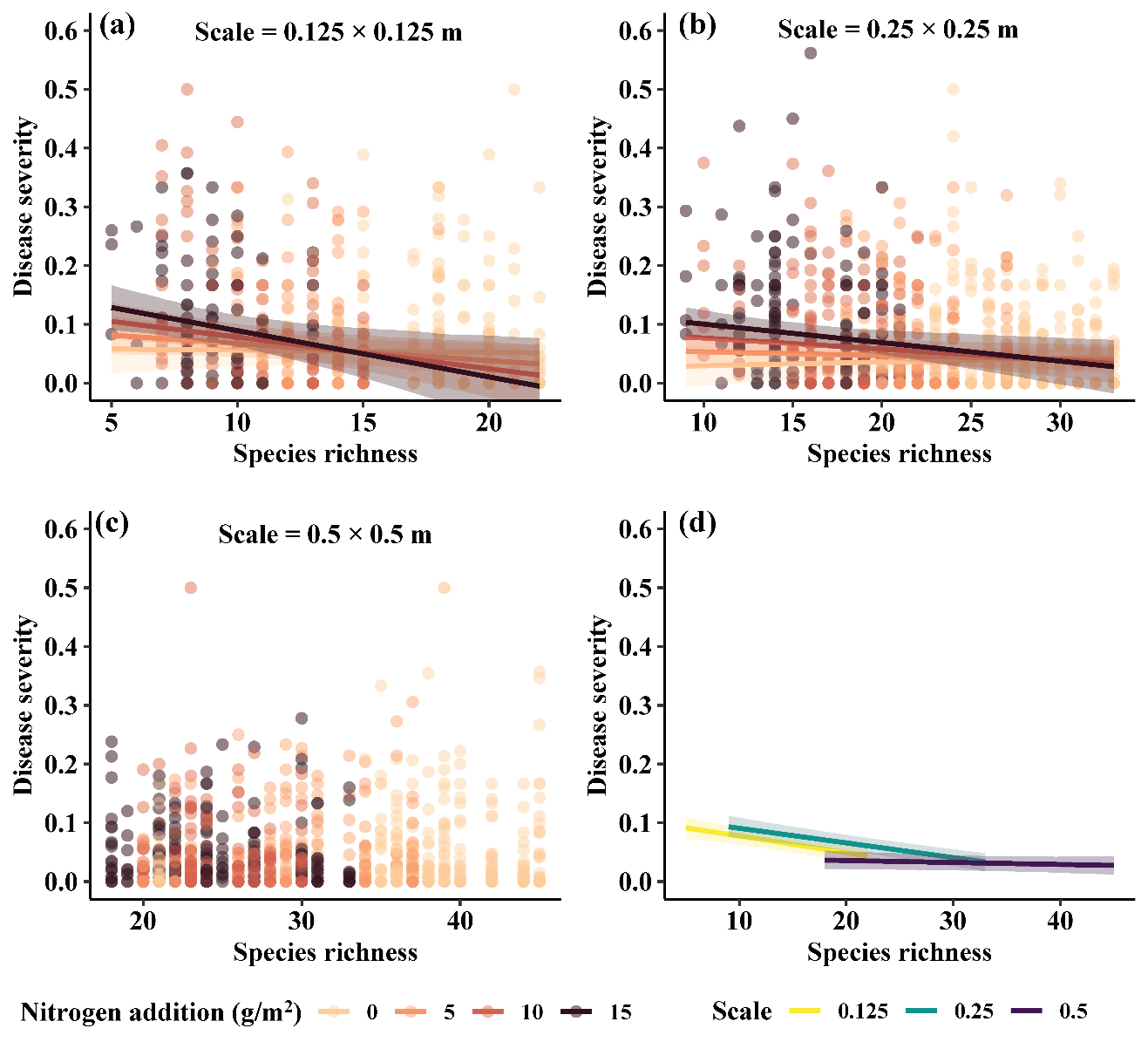 研究团队在长期施肥样地中分别设置样方面积为0.125×0.125m、0.25×0.25m和0.5×0.5m三种不同大小的样方,调查样方内植物叶片真菌病害严重度,结合宿主植物多度、非宿主植物相对多度、植物物种丰富度等指标,综合使用多模型推断、模型筛选、模型平均和结构方程模型等分析方法,发现在相对较小的空间尺度下,相遇率降低和易感宿主管制等触发稀释效应的机制往往较强,因此更容易观察到稀释效应;同时,氮添加能够通过直接途径,或降低植物多样性的间接途径影响叶片真菌病害,但间接途径通常在较小的空间尺度下发挥更重要的作用。