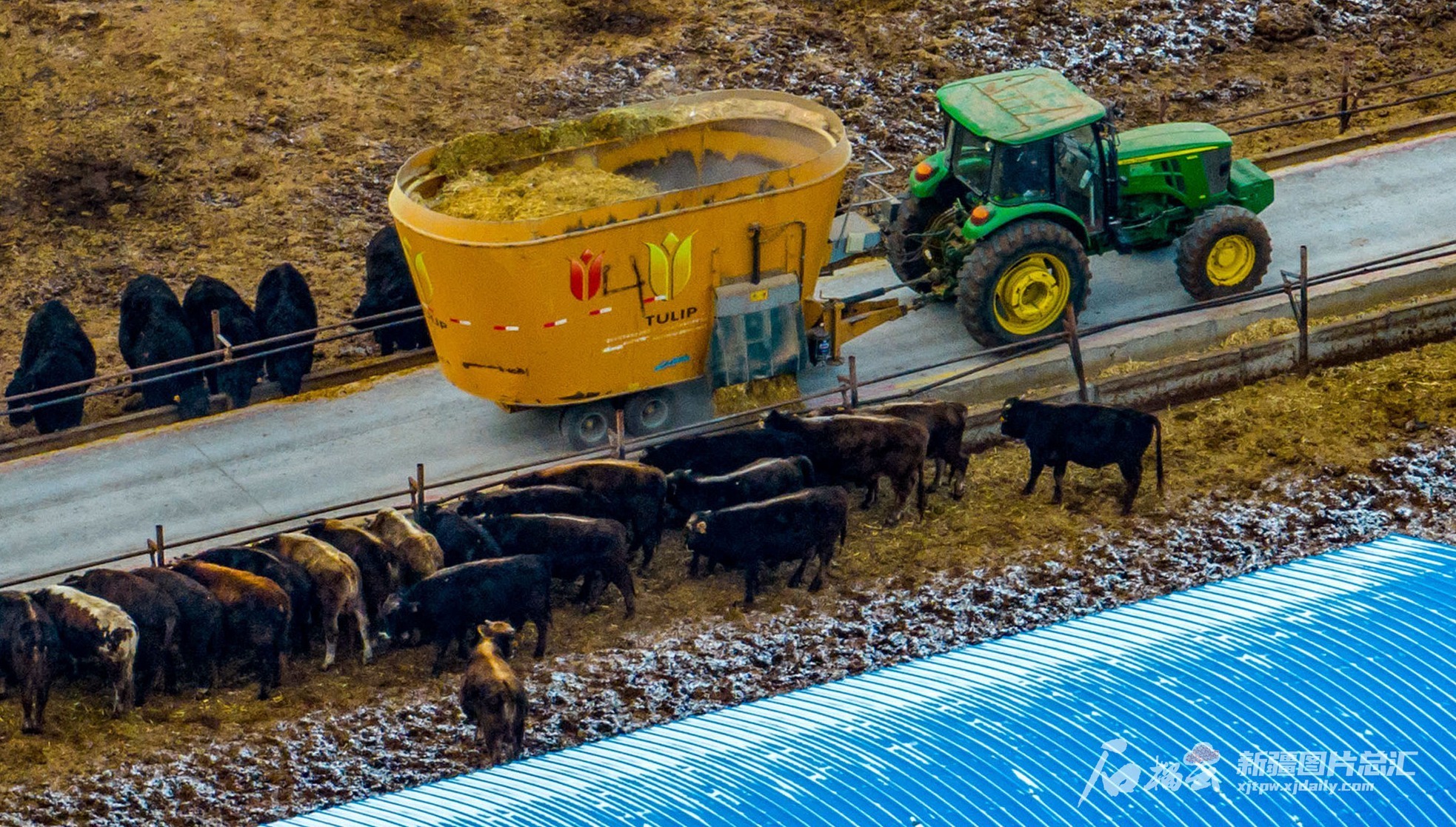 饲养员在博尔塔拉蒙古自治州博乐市阿热勒托海牧场天莱香牛牧业园区内为肉牛投喂饲草料(11月30日摄)。(摄影:夏特克·海拉提)