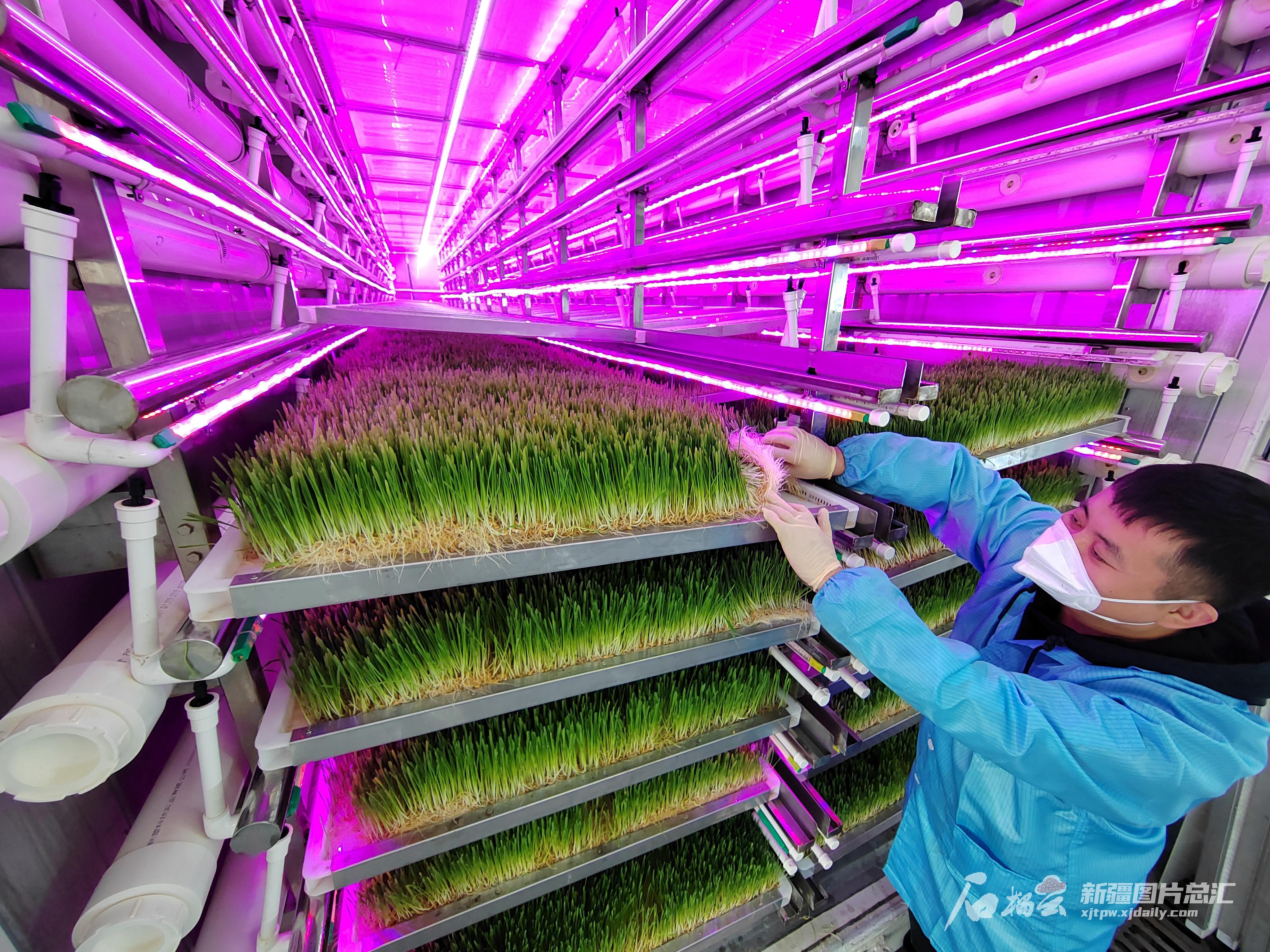 12月13日,新疆紫晶川梭高新农业股份有限公司智能种草工厂员工在查看智能种草箱内人工饲草的长势。(摄影:邹懿)