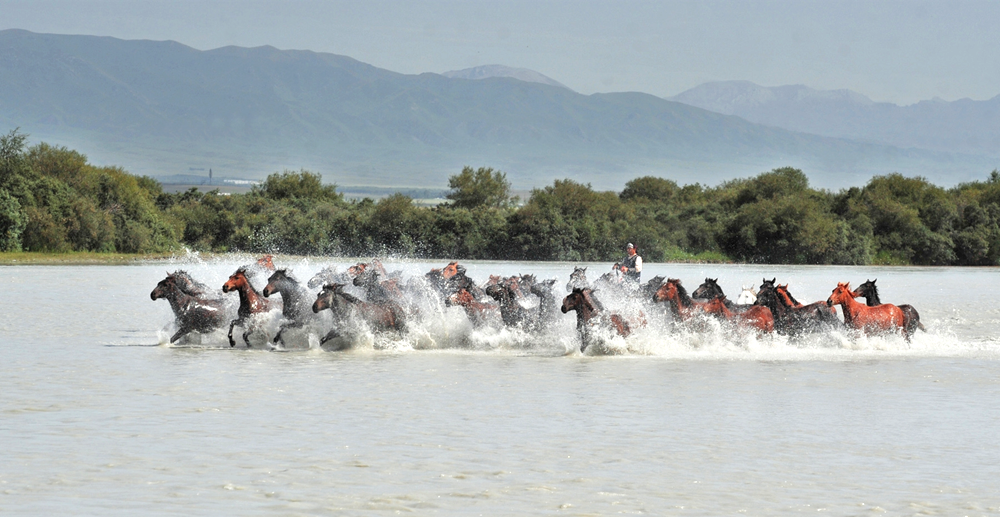 在昭苏湿地公园进行的天马浴河表演(7月25日摄)。伊犁哈萨克自治州昭苏县立足优势,多措并举推动产业融合发展,助力旅游文化发展,目前已初步构建“马产业+文化旅游”“马产业+体育”“马产业+城镇化建设”等融合发展模式。(摄影:约提克尔·尼加提)