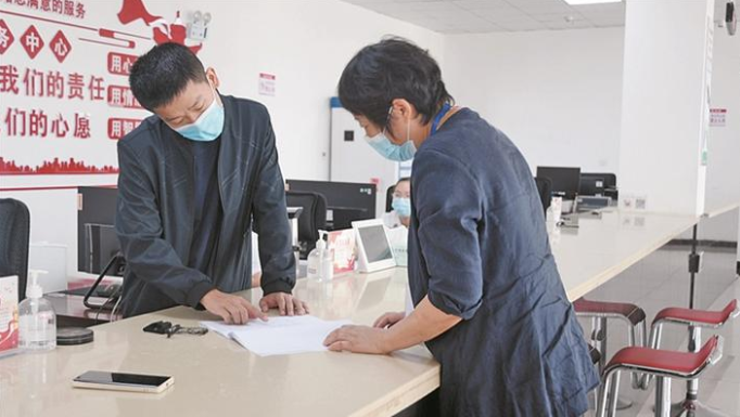 喀什经济开发区兵团分区政务服务中心工作人员(左)在企业服务中心为企业家答疑释惑(摄于9月20日)。 图片由喀什经济开发区兵团分区党工委提供