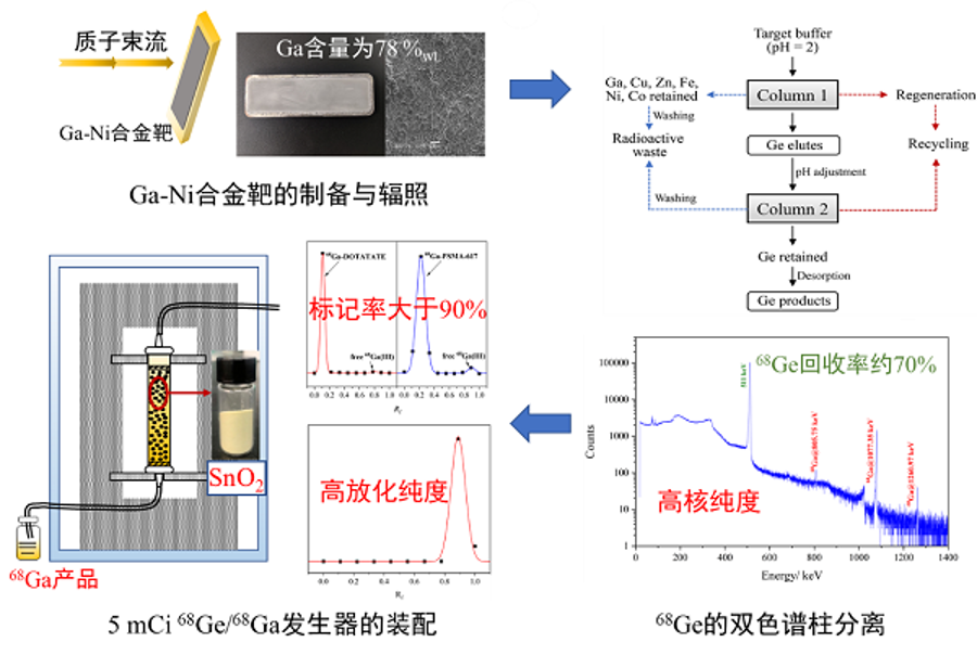 研究人员利用电镀法制备了大面积的镓-镍合金靶,镓的质量百分含量达到78%左右。利用质子束流轰击合金靶10小时,冷却后应用双色谱柱自动化分离装置分离纯化锗-68,研究人员成功制备了5毫居的SnO2基锗-68/镓-68发生器。