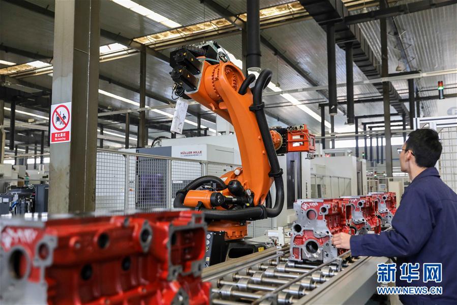 安徽全柴动力股份有限公司工业机器人在流水线上工作。新华社记者 曹力 摄