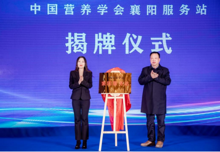 市政协副主席金崇保、市营养学会副理事长兼秘书长李贝西为中国营养学会襄阳服务站揭牌