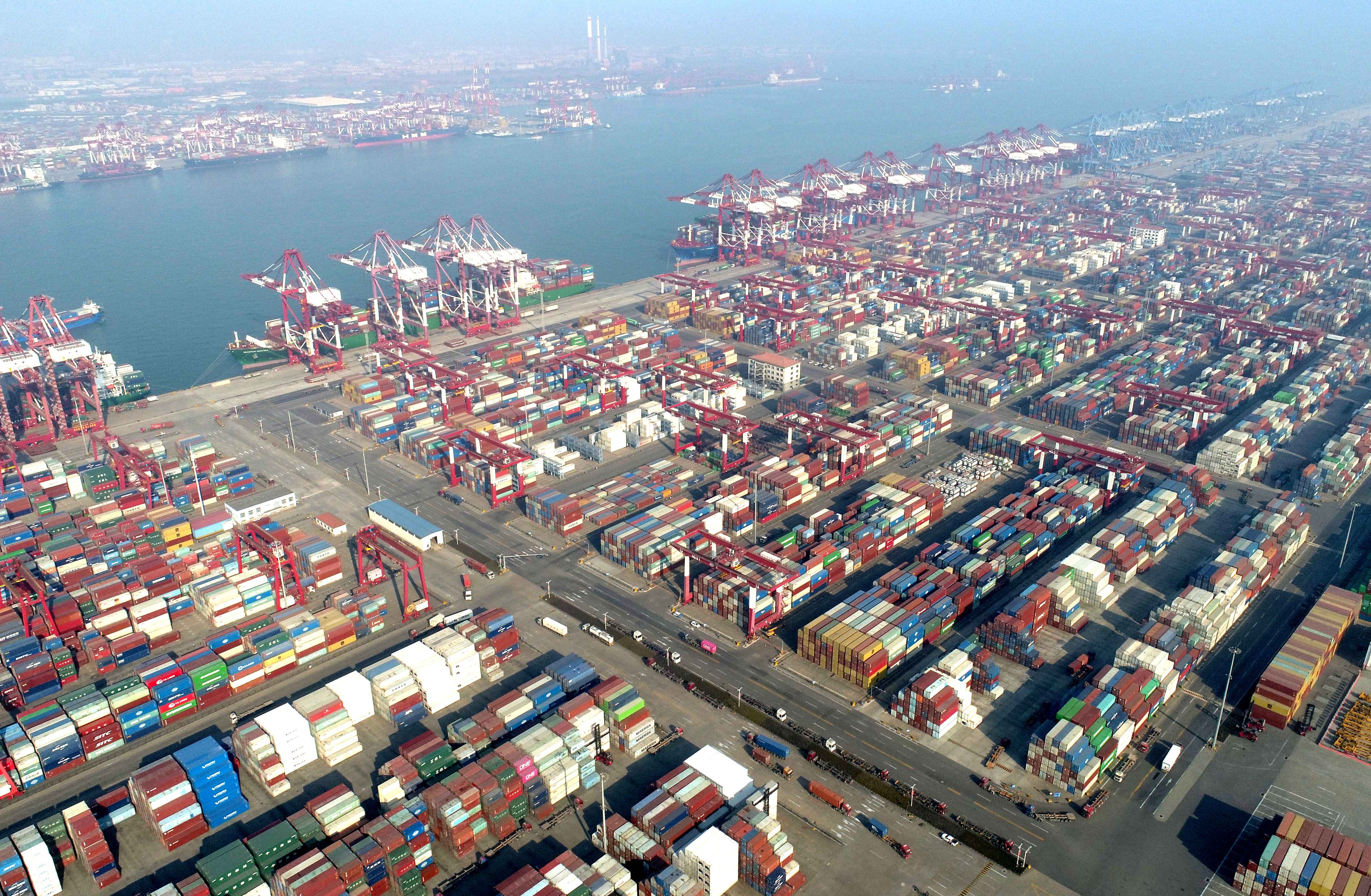 1月2日,在山东港口青岛港,巨轮频靠,各作业码头一派繁忙景象。