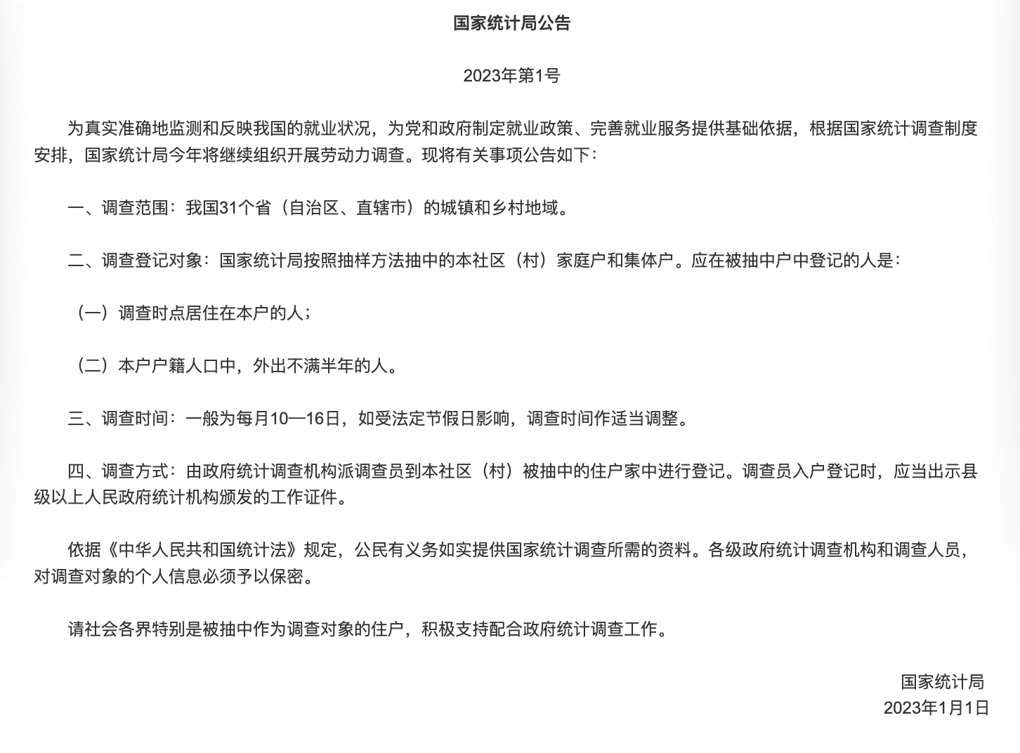 国家统计局近日于官网发布公告,将于今年继续组织开展劳动力调查。此次调查范围涵盖全国31个省(自治区、直辖市)的城镇和乡村地区,调查时间为每月的10到16日。