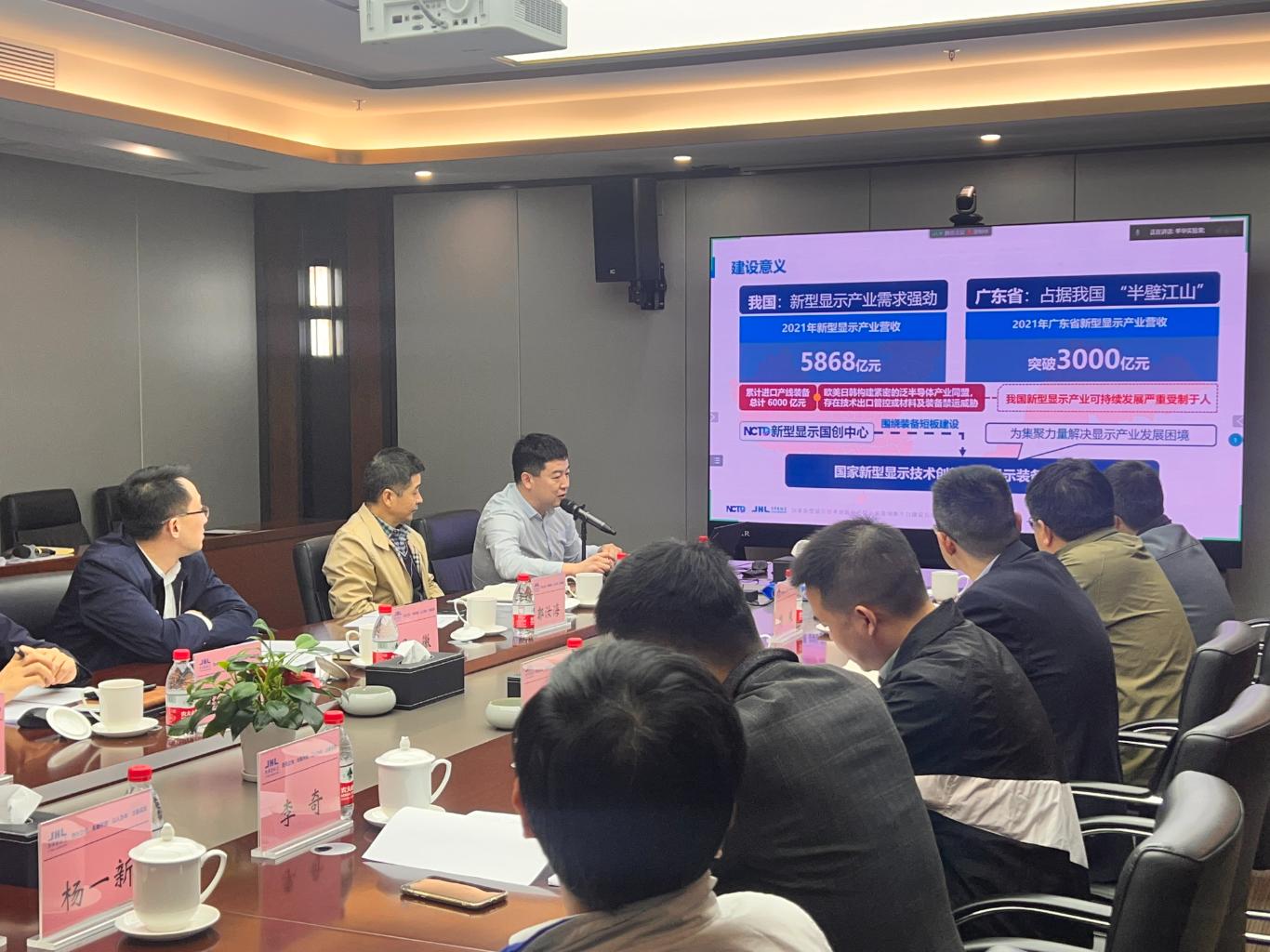 季华实验室科研管理处处长郭汝海汇报了显示装备创新平台的建设方案,详细论述了显示装备平台建设意义、依托单位情况、建设基础、建设目标和任务、建设布局。