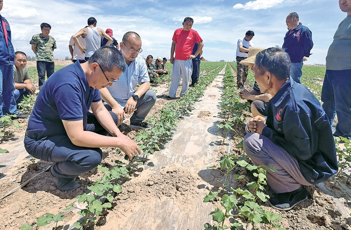 新疆农业科学院经济作物研究所研究员李雪源和新疆国欣农业科技有限公司相关负责人带领技术人员在轮台县塔尔拉克乡国欣农场查看棉花长势(摄于6月7日)。