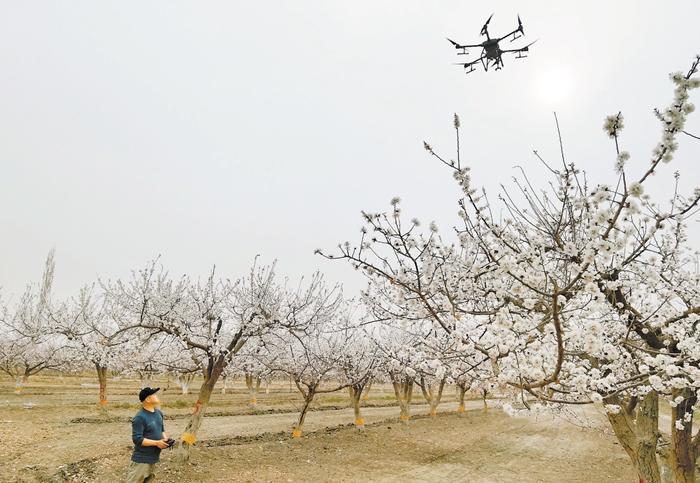 轮台县杏子产业科技专家服务团在阳霞镇库都克村开展白杏蜂机协同授粉(摄于3月22日)。