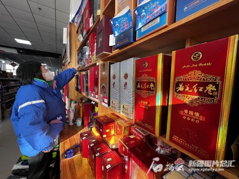 2022年12月29日,若羌县居民在一家超市选购红枣酒。石榴云/新疆日报记者杜建辉摄