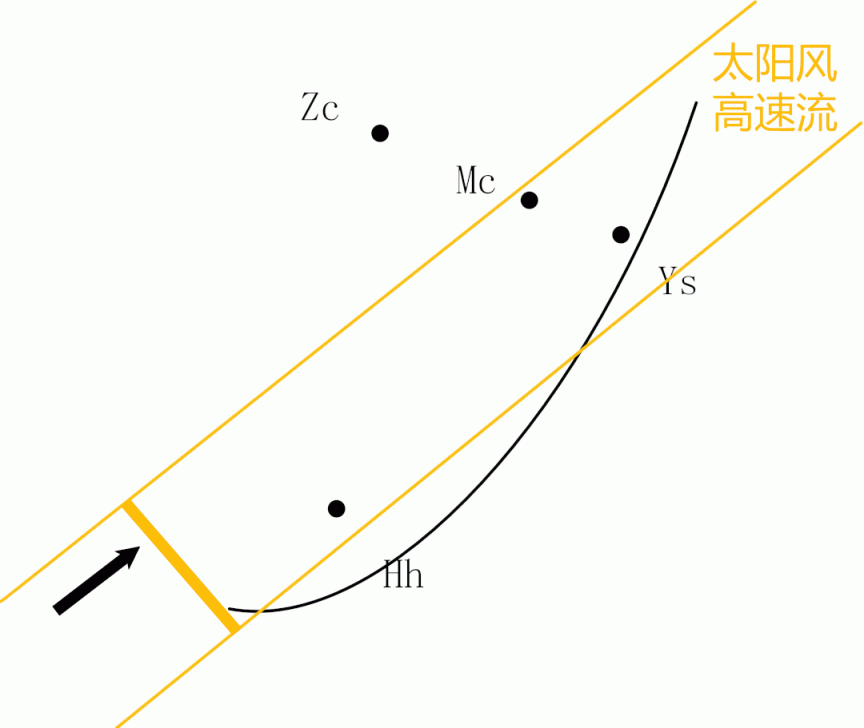 图3 2021年10月9日,火星投影点距离日心2.6 Rs时,日冕物质抛射引起的“天问一号”(a)和“火星快车”(b)的频率和载噪比扰动变化。Hh:南非哈特比斯特胡克测站;Ys:西班牙耶韦斯站;Mc:意大利梅迪奇纳站;Sv、Zc和Bd:俄罗斯的斯韦特拉耶测站、泽连楚克斯卡雅测站和班达拉测站;Yg: 澳大利亚亚拉测站。CME在07:09到达火星投影点,CME前沿在07:20到达火星投影点,07:32离去,11:00之后恢复背景太阳风状态。07:20~07:32之间,频率扰动达到±20Hz。时间为世界协调时(UTC)。同时,在火星投影点附近更小的空间尺度范围内,观测到了因CME与冕流相互作用引起的冕流波。冕流波是一种大尺度日冕波动现象,又被称为“太阳上空飘扬的彩带”,反映了磁场对太阳风等离子体运动的约束情况。通常情况下,冕流波是利用光学手段通过日冕仪进行观测,但会受到观测背景亮度的限制。此次,通过射电方法观测到了背景较暗且光学手段无法分辨的冕流波细节结构,为未来开展冕流波观测提供了一种新方法。