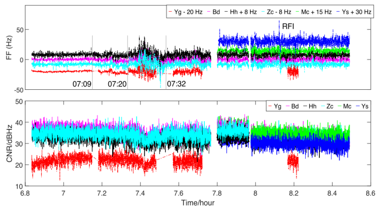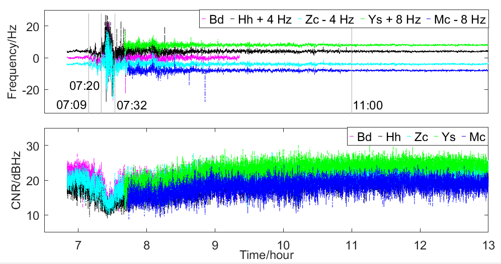 由于相同的频率扰动信号抵达不同位置测站的时间不同,通过频率扰动信号与各测站之间的传播距离与传播时间,可计算得到CME的等离子体抛射速度,因此多站联测可以用来研究临日空间太阳活动的空间传播情况。