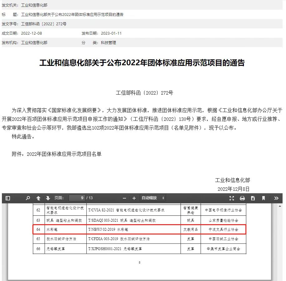 2023年1月11日,国家工信部发布《关于公布2022年团体标准应用示范项目的通告》(工信部科函〔2022〕272号),宁波文具行业协会申报的《水彩笔》团体标准被工信部遴选为2022年团体标准应用示范项目。这是宁波、也是全省文具行业唯一入选项目。