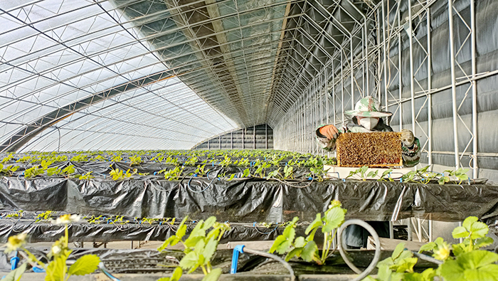 1月11日,在库尔勒市英下乡一草莓种植大棚内,工作人员打开蜂箱放出蜜蜂为草莓授粉。据了解,这里是巴州种蜂场设施农业蜜蜂授粉实验基地,小蜜蜂成了果农们提高草莓产量的“秘密武器”。
