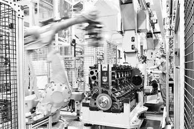 图为在位于山东潍坊的潍柴集团总装车间,机器人在流水线上装配发动机。新华社记者 郭绪雷摄