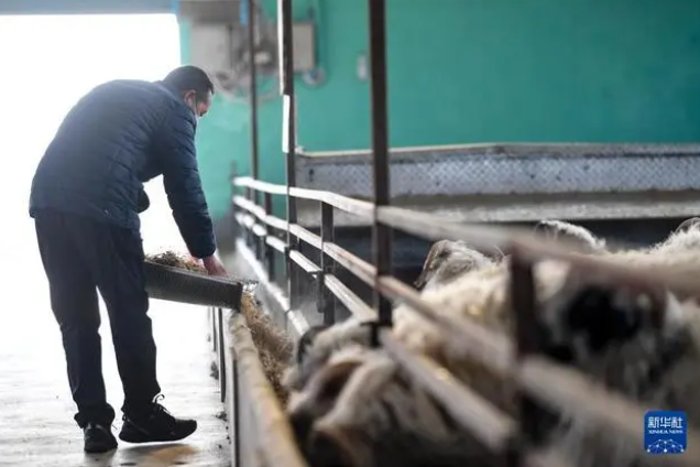牧场员工在给滩羊添加草料。新华社记者 冯开华 摄