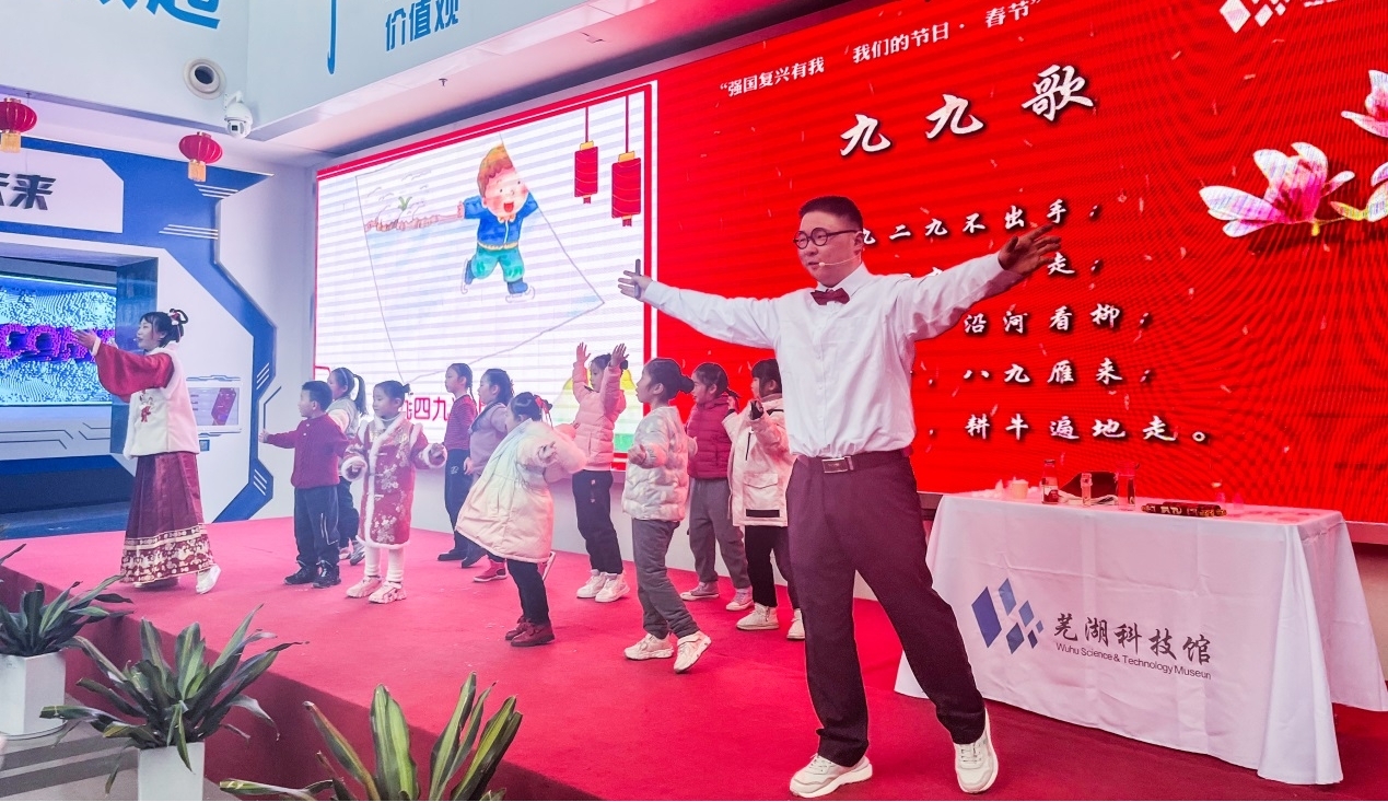 科学表演秀“中国传统文化中的科学—立春”。近年来,芜湖科技馆研发了“中国传统文化中的科学”系列表演秀,今年春节推出了24节气中的立春。通过一位穿越到现代的“古代网红”和现代科学达人的激情碰撞,介绍二十四节气的由来,与立春节气的的传统习俗,通过现场古今大PK,展现古今传统的差异和传承。通过科学表演秀,烘托了节日气氛,让观众感受到中国传统文化的独特魅力。