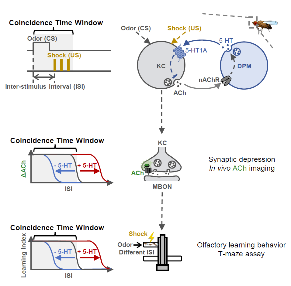 据论文的共同第一作者曾健智博士和博士研究生李雪霖介绍,果蝇在“气味—电击”训练后会对特定气味形成恐惧记忆。早在1985年科学家就发现,随着“气味”和“电击”的时间间隔增加,果蝇的学习效果逐渐变差。在此次研究中,李毓龙团队成员复现了这个经典实验,测得果蝇的“一致性时间窗口”为16.9秒。当通过遗传学手段降低五羟色胺水平时,对应“一致性时间窗口”缩短至10.8秒;当通过抗抑郁药增加五羟色胺水平时,能够相应地延长时间窗口至25.2秒。研究人员由此发现,“一致性时间窗口”的长短并非固定不变,而是大脑中一个能够被五羟色胺水平双向调节的动态变量。