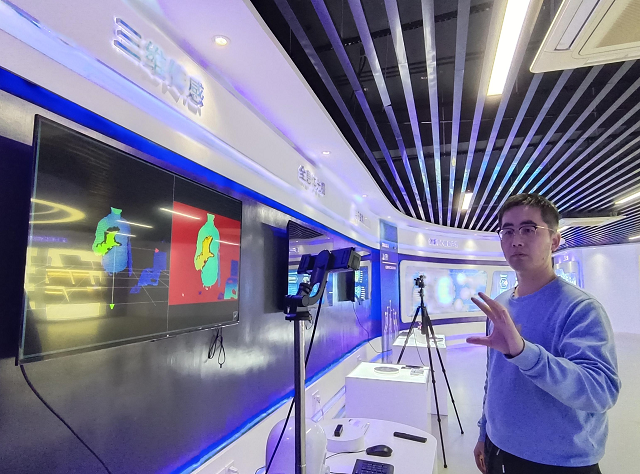 工作人员向记者展示功能先进的“RGB-D深度相机”