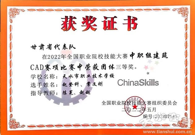 中职组“建筑CAD”赛项2022年8月4日-7日,在广西南宁建设职业技术学院举行,共有来自全国31个省、自治区、直辖市和新疆生产建设兵团的64支参赛队参加。由天水市职业技术学校教务主任韩天德担任领队,专业教师陈冕、任伟指导,赵登科、常文刚同学组成的参赛队代表甘肃省取得了团体三等奖的好成绩。