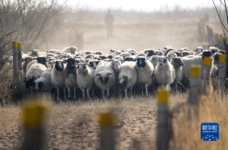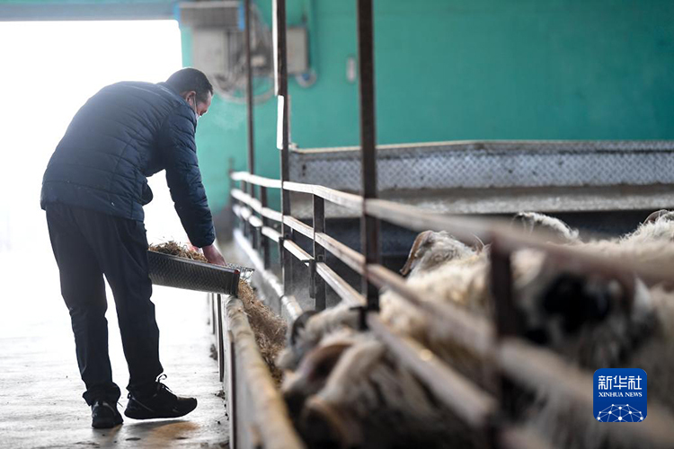 宁夏盐池县宁鑫生态牧场员工在给滩羊添加草料(1月12日摄)。新华社记者 冯开华 摄