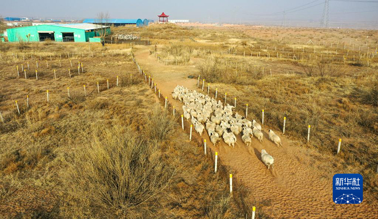 宁夏盐池县宁鑫生态牧场养殖的滩羊在跑道上“跑步”(1月12日摄,无人机照片)。新华社记者 冯开华 摄