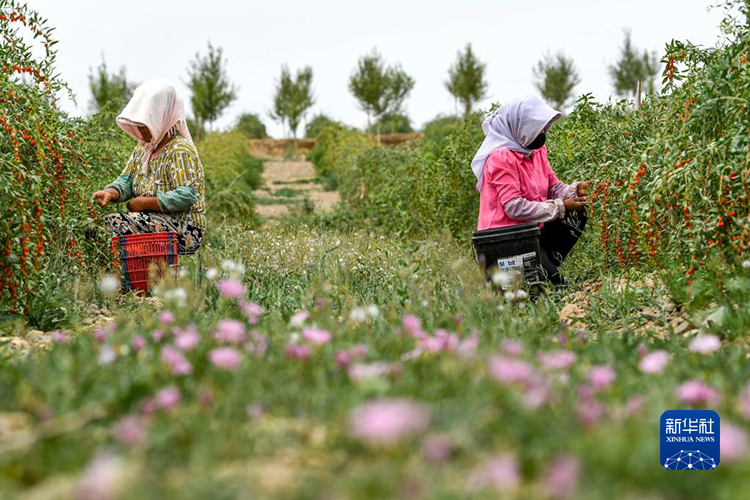 采摘工在宁夏中宁县一家枸杞庄园采摘枸杞(2020年6月30日摄)。新华社记者 冯开华 摄