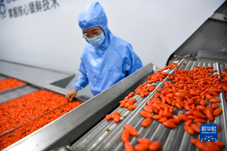 工人在宁夏一家枸杞加工企业的锁鲜枸杞生产线上清洗、拣选枸杞鲜果(2020年6月22日摄)。新华社记者 冯开华 摄