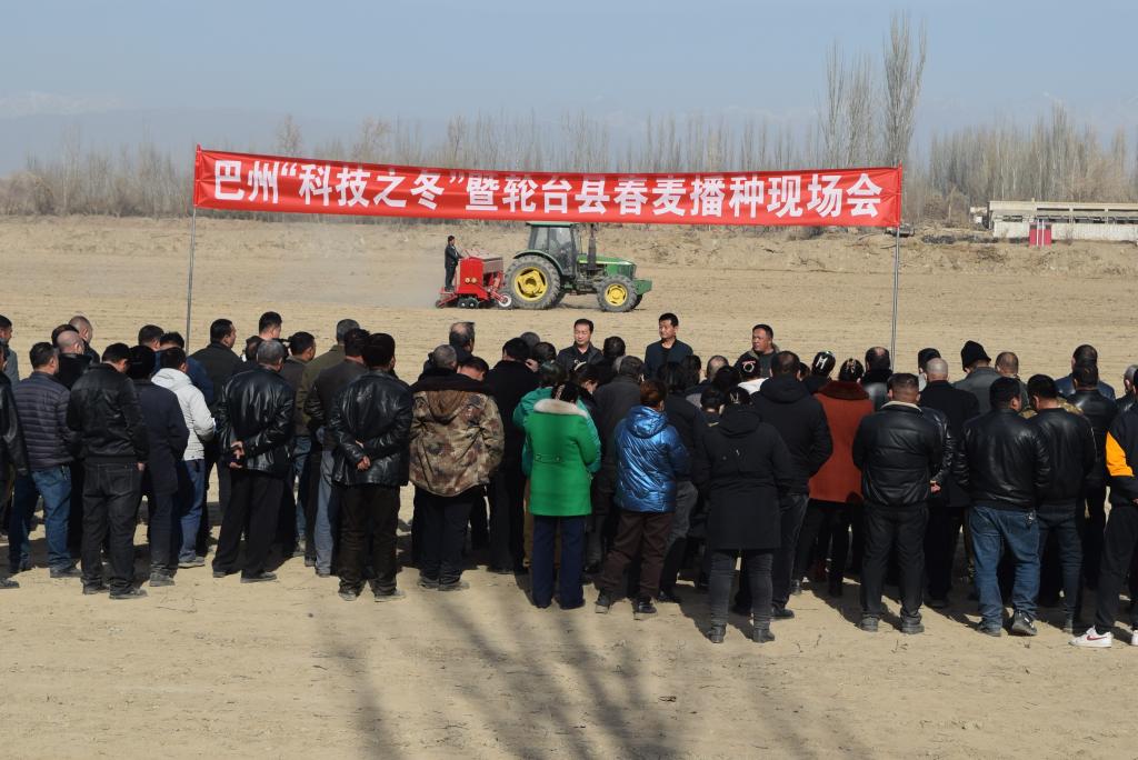 “冬去大地暖,播种正当时”,轮台县阿拉萨依村举办的春麦播种现场会上,巴州农业技术推广中心专家正在向群众讲解春小麦播种知识
