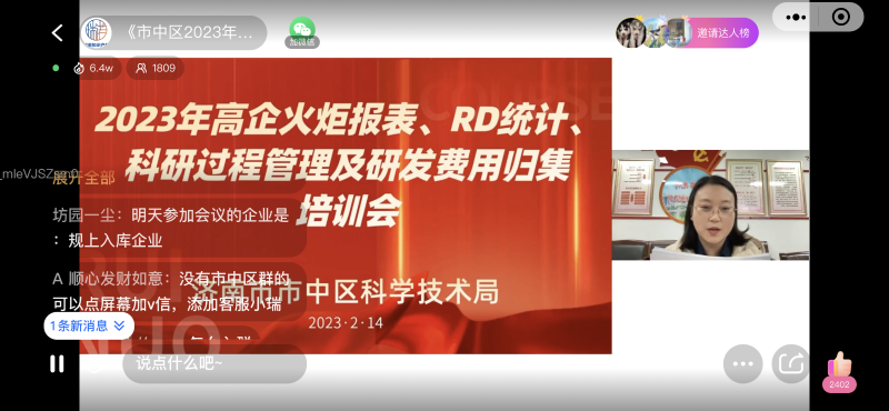 为进一步推动济南市市中区科技工作开展,加强高企火炬年报填报、规上企业RD统计填报等相关工作的规范性,引领全区域重视科研过程管理和研发投入合规性,市中区科技局创新工作模式,于2月14日率先开启线上直播互动专题培训会。对科小入库、RD网上填报、高企申报相关流程等科技工作进行全面培训,同时创新理念,融合当下线上直播模式,邀请不分省市区的各类科技型企业进行互动,此次培训会共有1800人次参加,6.8万次浏览互动。