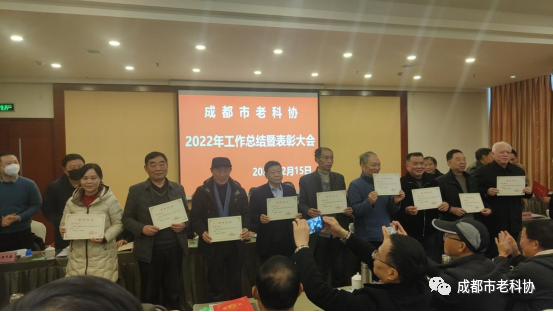 会上,成都市老科协表彰了郫都区老科协等45个先进集体和唐俊林等95名先进个人,并向先进集体和先进个人颁发了奖励证书。 宣读了获得中共成都市委组织部、中共成都市委城乡社区发展治理委员会、中共成都市委老干部局表扬的龙泉驿区老科协等5个先进集体和熊之林等5名先进个人。