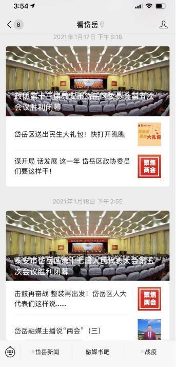 会议期间,电视、广播、“岱岳融媒”客户端开设《2021岱岳两会时间》专题专栏,及时跟进“两会”重大议程,直播、专访、新闻、H5、海报、短视频、互动类融媒产品亮点频现,运用多平台、全媒体矩阵,为全区人民全景式报道“两会”盛况,全面解读精彩内容。