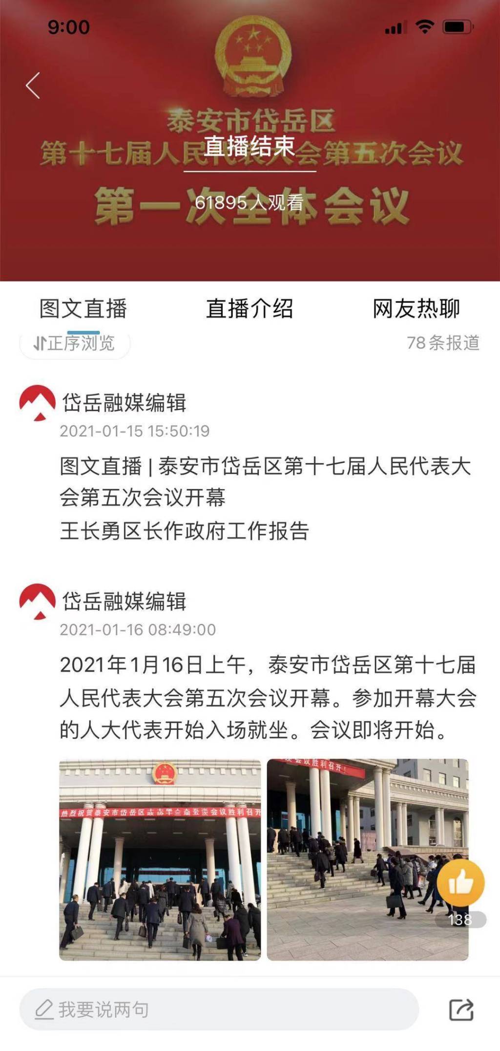 首次采用图文直播“两会”,让广大群众与会场“零距离”接触。《图文直播|泰安市岱岳区第十七届人民代表大会第五次会议开幕》,41张组图,展示了岱岳经济社会各方面发展成就,与来自大会现场、分会场和部分镇街园区观看大会直播的图片配合报告中的文字同步直播,生动直观地解读了报告内容。开幕式直播在线观看人数达6万余人次,收到评论300多条。