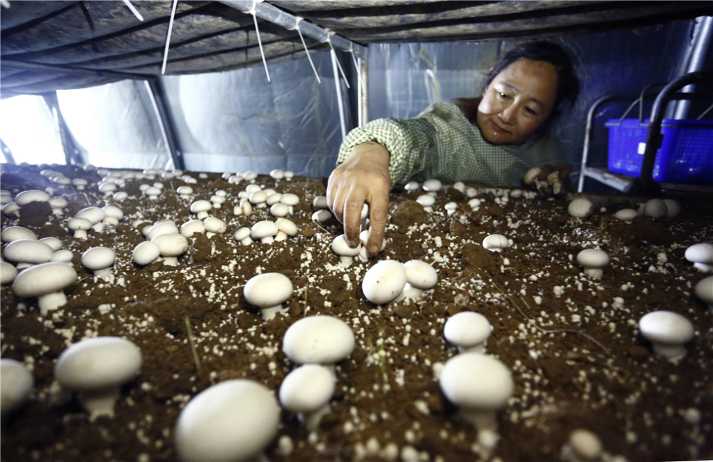 祝阳镇扶贫大棚里农户采摘双孢菇
