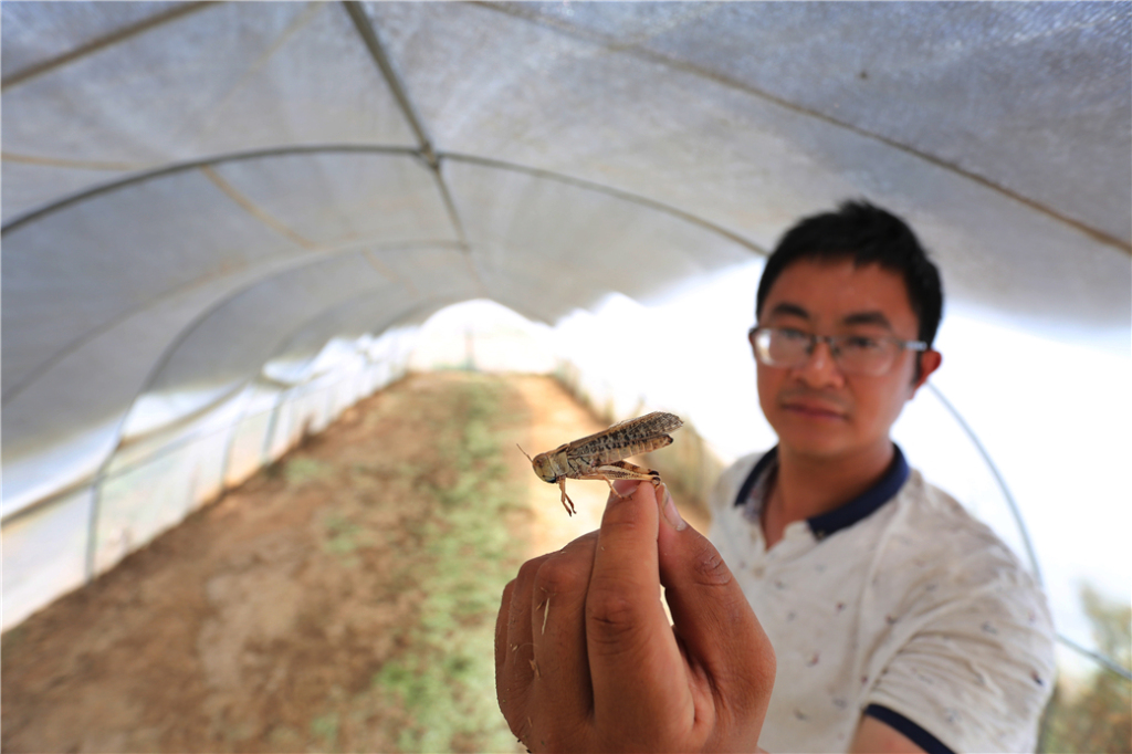 马庄镇洼口村的蚂蚱养殖大棚里张大鹏在查看蚂蚱成长情况