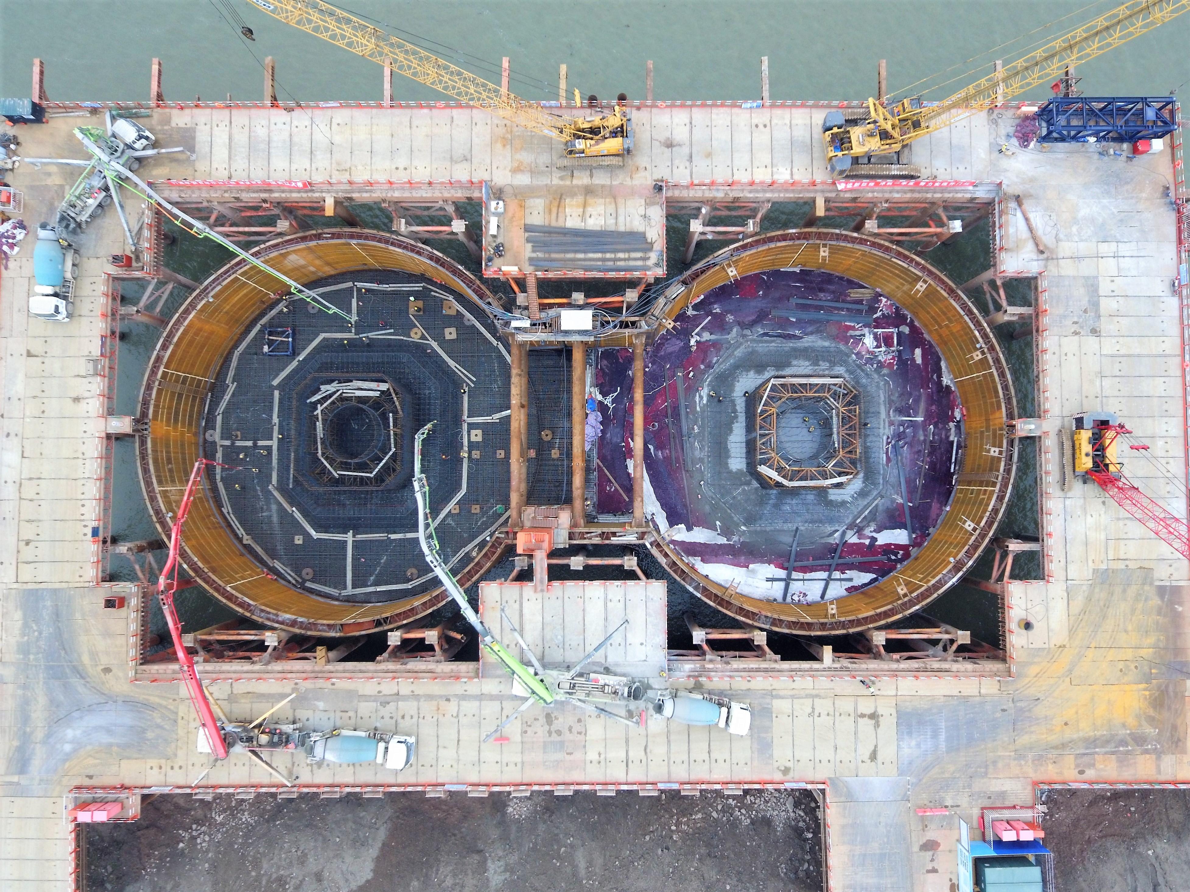 此外,项目团队还在承台内设置了由中铁大桥科学研究院开发的智能温控设施,实时监控大体积混凝土温度,并利用承台内布设的冷却水循环系统,进行混凝土温度调控,防止混凝土因水化热引起结构裂缝,确保工程质量。