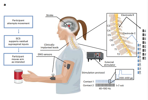 最新一期《自然·医学》发表的一项临床研究报道,对颈脊髓进行硬膜外电刺激,改善了两名中风后慢性肌力不足患者手臂和手的运动和力量。这些数据提供了初步证据,表明脊髓刺激(SCS)作为一种中风后上肢康复方法的潜力。