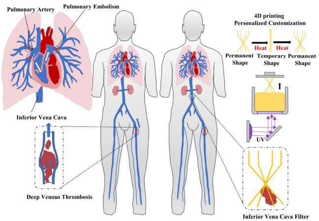 4D打印形状记忆下腔静脉滤器微创治疗PE的设计示意图。课题组供图